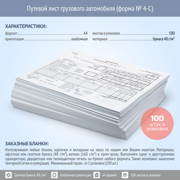 Путевой лист грузового автомобиля (форма № 4-С, упаковка из 100 штук) в Самаре купить